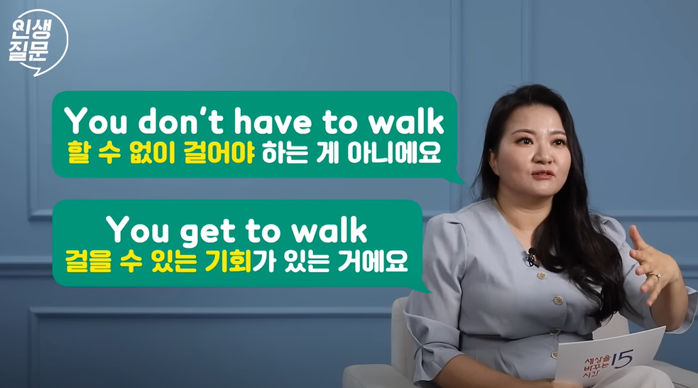- “나는 운동을 해야 해(I have to exercise)” → “나는 몸을 움직일 기회가 있어요(I get to exercise)”