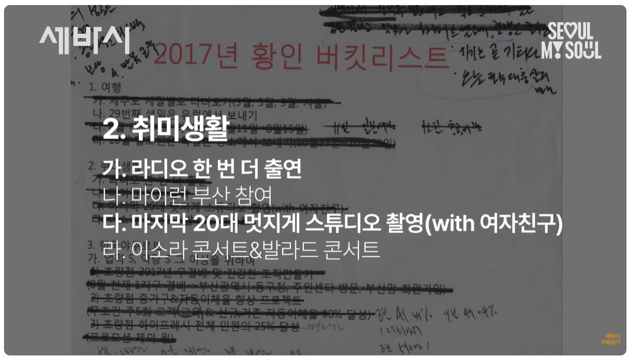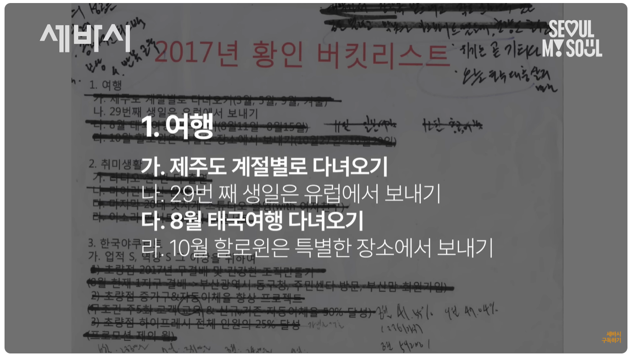 황인은 24살에 처음으로 버킷리스트를 작성하며 자신의 삶을 계획하기 시작했습니다. 그는 10년, 1년 단위로 목표를 설정했고, 이를 통해 삶의 방향성을 명확히 했습니다.