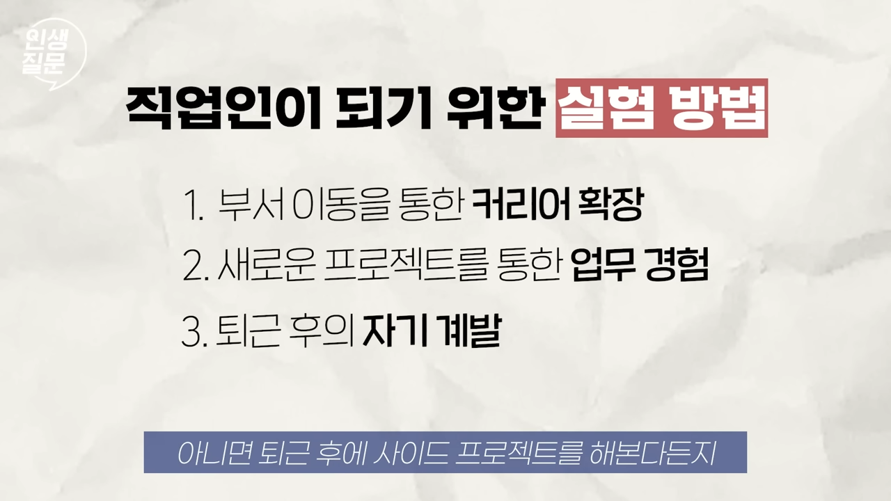 많은 직장인들은 상사의 요구에는 익숙하지만, 정작 자신이 원하는 것이 무엇인지 잘 모릅니다. 고민만 하지 말고, 직접 다양한 시도를 해보는 것이 중요합니다.