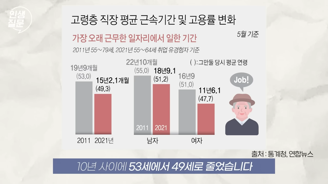- 정년퇴직은 점점 어려워진다: 2011년과 2020년 통계를 비교해 보면, 가장 오래 근무한 직장에서 퇴직하는 연령이 53세에서 49세로 줄었습니다. 앞으로는 40대 중반까지 내려갈 가능성이 높습니다.